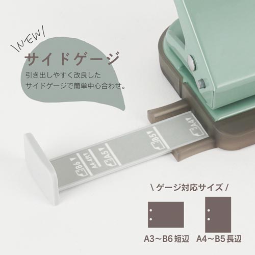 コンパクトで美しいカラーと機能が豊富な2穴パンチです。用紙の中央合わせに便利なサイドゲージはA4長辺4穴にも対応です。ハンドル部分は押し下げた状態でロックできるので引き出し等にも収納できます。