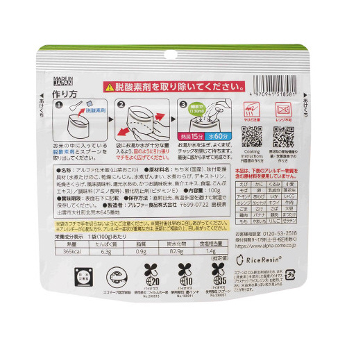 アルファ化米なので熱湯15分、水の場合 60 分でできあがります。特定原材料等(アレルギー物質)28品目不使用の食物アレルギーに配慮した長期保存食。