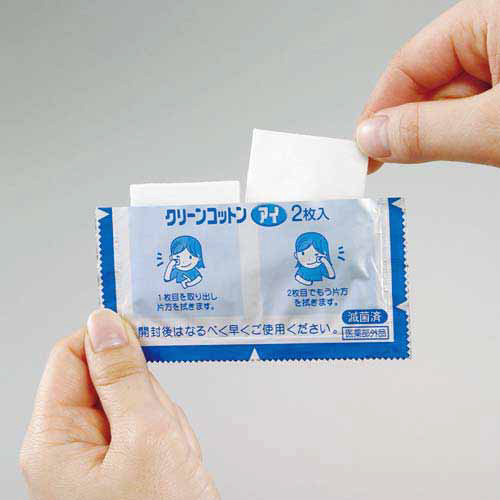 4方どこからでも開封することができる個包装です。また、脱脂綿を清潔に取り出すことができる位置が強調されています。アルミ包装が水分の蒸発を防ぎ、常に清潔な状態で使用できます。
