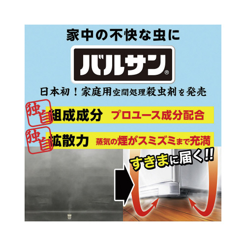 バルサン史上初!家電にも植物にもカバー不要で、不快害虫をお部屋まるごと駆除します。火を使わない、水ではじめるタイプ。蒸気の煙なのでお部屋を汚しません。タンスの裏、ソファーの下などにも届きます。
