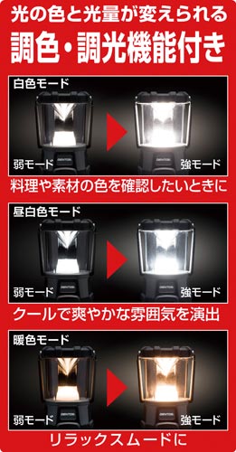 白色、暖色点灯モデル。充電池と乾電池を併用可能。給電機能もついており、防災やレジャーなど様々なシーンにて活躍するランタン。