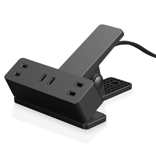 クリップ機構を搭載し、机などに挟んで利用することができる2ピン式の3個口タップです。タップを常設できないダイニングテーブルなどでテレワークや宿題をする際に、一時的に設置して利用するのに便利です。
