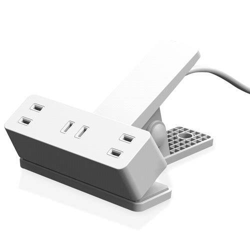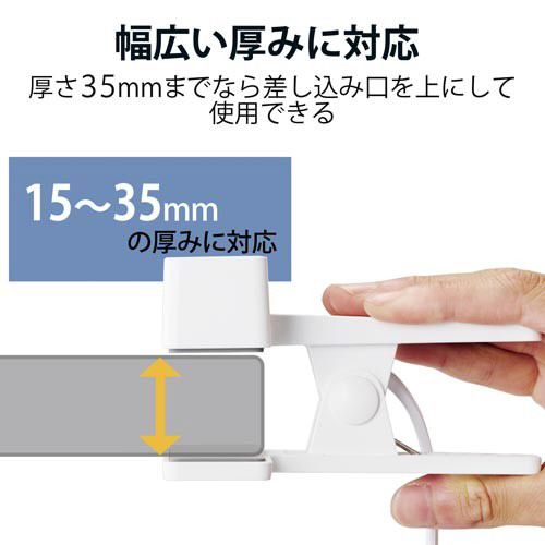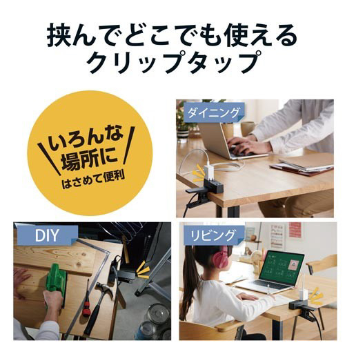 クリップ機構を搭載し、机などに挟んで利用することができる2ピン式の3個口タップです。タップを常設できないダイニングテーブルなどでテレワークや宿題をする際に、一時的に設置して利用するのに便利です。