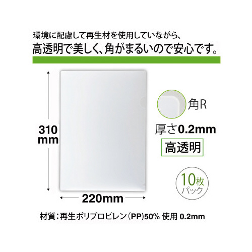 再生材を使用し環境に配慮した高透明クリアーホルダー。 高透明でワンランク上の美しさ、中身の書類も一目瞭然です。全ての角が丸いから、カバンに入れても傷つきにくい。シート厚0.2mmで品質もしっかり。