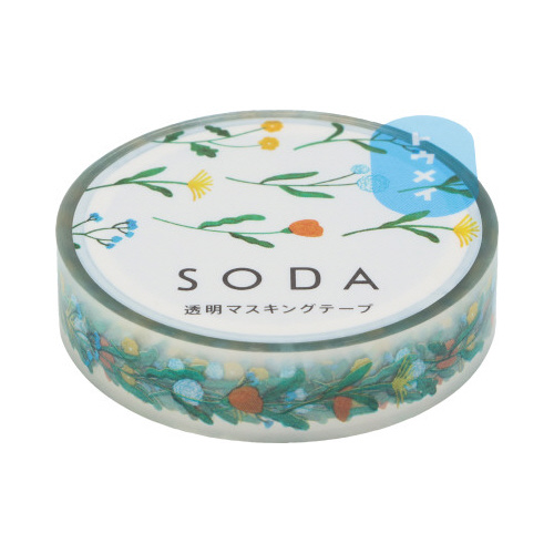 「SODA」は貼ってはがせる透明フィルム素材のマスキングテープです。透明度の高いフィルム素材を使用しているので下地の色を生かせます。貼ってはがすことができ、DIYや手帳づくりなどにも。