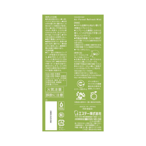 ●成分/エタノール、天然樹木抽出水、香料、非イオン系界面活性剤、除菌剤
