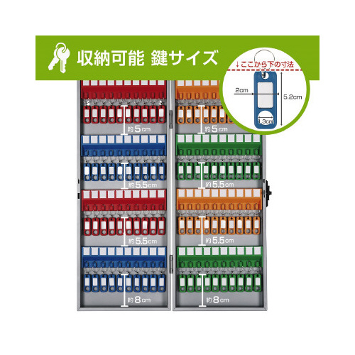 ●付属品/キーホルダー80個(赤、青、橙、緑各20個)、キーハンガー8個(赤、青、橙、緑各2個)、開錠用キー2個、ネジ3本、コンクリート用プラグ3本