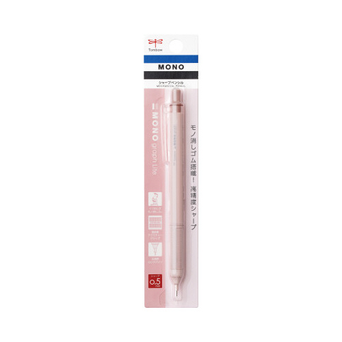 繰り出し式のモノ消しゴム搭載!広視界ロングパイプと指が滑りにくい高密度テクスチャグリップを採用した高精度シャープペン。0.5mm芯、グレイッシュピンク軸