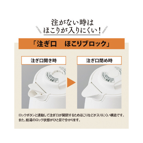 ●機能/空炊き防止、転倒湯漏れ防止、自動電源オフ、蒸気セーブ構造、注ぎ口ほこりブロック、給湯ロックボタン、本体二重構造