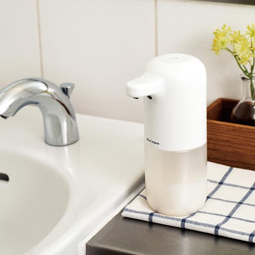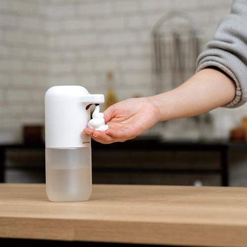 触れずに衛生的。「手をかざすだけ」の泡タイプのソープディスペンサー。乾電池式で邪魔なコードは排除、洗面台の小さなスペースにも設置できるスリムなデザイン。量は2段階で調節可能