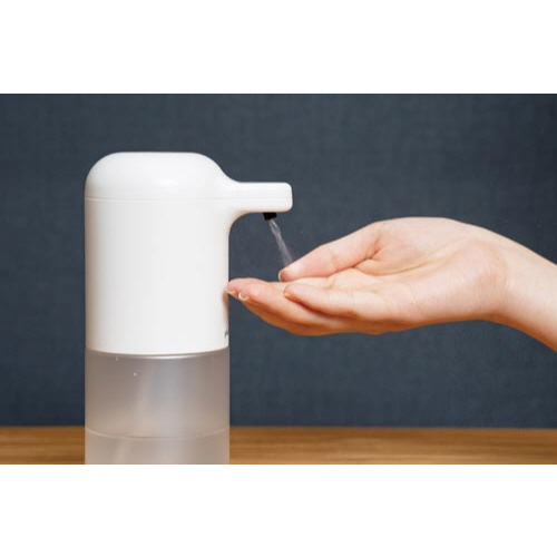 触れずに衛生的。「手をかざすだけ」のアルコールディスペンサー。乾電池式で邪魔なコードは排除、洗面台の小さなスペースにも設置できるスリムなデザイン。量は2段階で調節可能