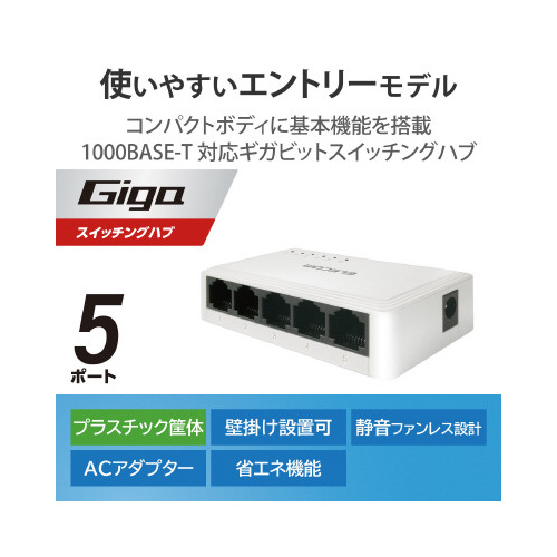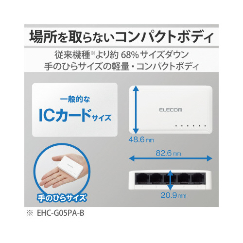 従来機種(※)より容積比で約68%サイズダウン。1000BASE-T対応ACアダプター電源のプラスチック筐体5ポートスイッチングハブです。※従来機種:EHC-G05PA-W