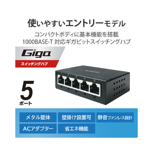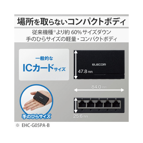 従来機種(※)より容積比で約60%コンパクト。1000BASE-T対応ACアダプター電源のメタル筐体5ポートスイッチングハブです。※従来機種:EHC-G05PA-B
