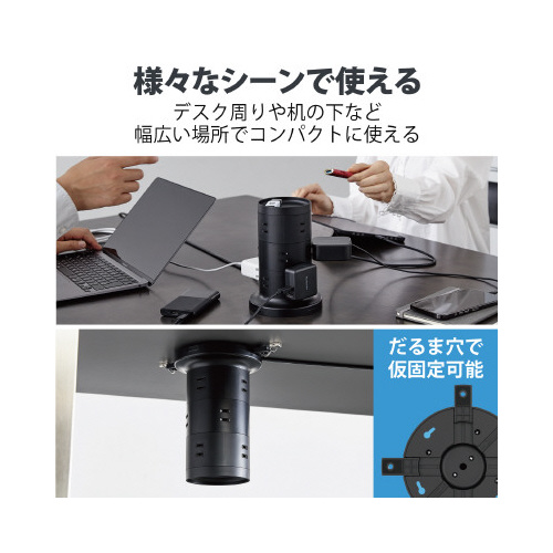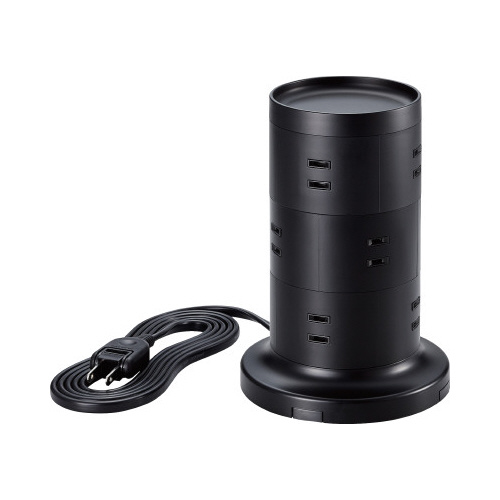 360度から接続できる12個の差込口を備えたタワー型の電源タップ。製品上部はトレー形状になっており、小物の収納が可能です。二重構造の差込口やホコリ防止シャッター、雷ガードやスイングプラグなどの機能も。