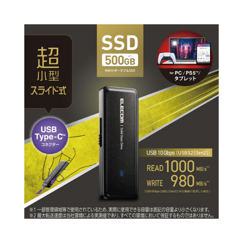 USBType-Cスライドコネクターを採用したUSB10Gbps(USB3.2(Gen2))外付けポータブルSSD。読み込み最大1000MB/s、書き込み最大980MB/sの高速データ転送を実現。