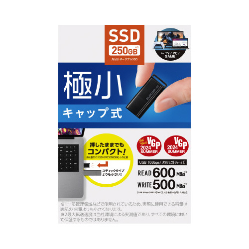 極小サイズでパソコン、テレビ、ゲーム機などに挿したままでもコンパクト。USB10Gbps(USB3.2(Gen2))外付けポータブルSSD。読み込み最大600MB/sの高速データ転送を実現します。