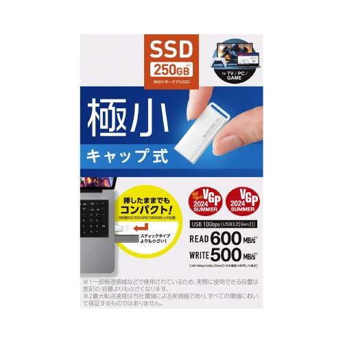 極小サイズでパソコン、テレビ、ゲーム機などに挿したままでもコンパクト。USB10Gbps(USB3.2(Gen2))外付けポータブルSSD。読み込み最大600MB/sの高速データ転送を実現します。