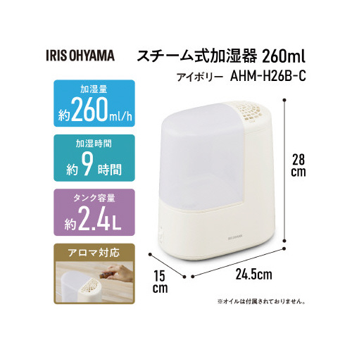 どんな場所にも置けるスリムデザインで、デスクやリビングテーブルで使用できるスチーム式加湿器です。アロマトレー付なので、気分に合わせて香りを楽しむことができます。