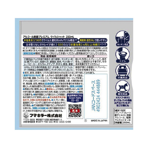 ●主成分/GSE(グレープフルーツ種子エキス)、発酵アルコール、電解アルカリイオン水