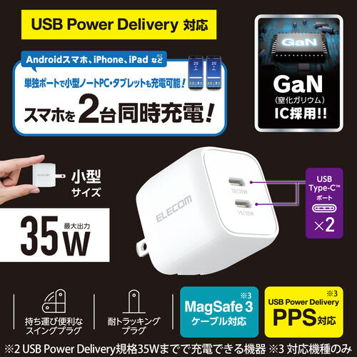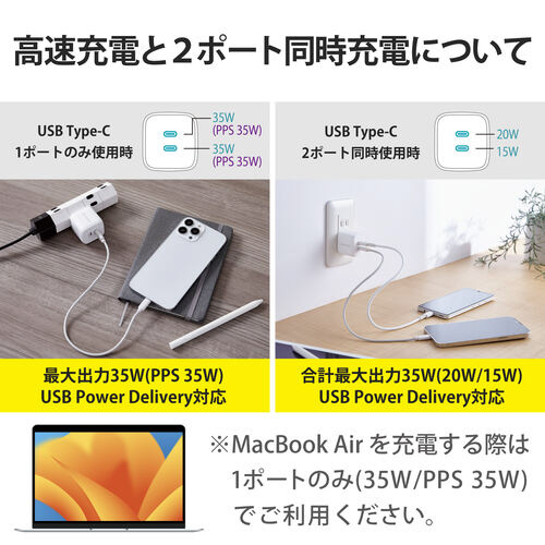 ●対応機種/各USBType-C(TM)(USB-C(TM))ポートからUSBPowerDelivery(35W)及びオプション規格であるPPS(ProgrammablePowerSupply)の規格内で充電が可能な機器。2ポート同時接続時も合計最大35Wまでの出力で充電、給電可能な機器とその組み合わせ。