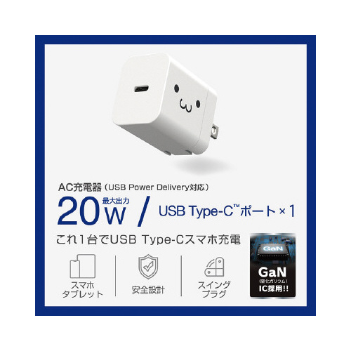 USBPowerDeliveryに対応したUSBType-Cポートを1ポート搭載し、対応するスマートフォン、タブレットなどを充電できるUSBAC充電器。隣の差込口に干渉しないスリムなデザイン。