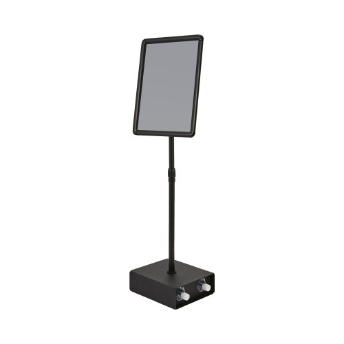 風に強いポスタースタンド。2Lのペットボトルを2本収納することで転倒防止になります。ポール部分の高さ調節、表示面の角度調節が可能です。
