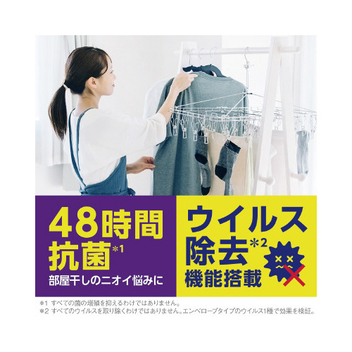48時間抗菌で、菌による三大ニオイ悩み「部屋干し臭」、「干し忘れ臭」、「戻り生乾き臭」をしっかり防ぎます。