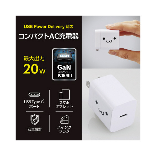 USBPowerDeliveryに対応したUSBType-Cポートを1ポート搭載し、対応するスマートフォン、タブレットなどを充電できるUSBAC充電器。隣の差込口に干渉しないスリムなデザイン。