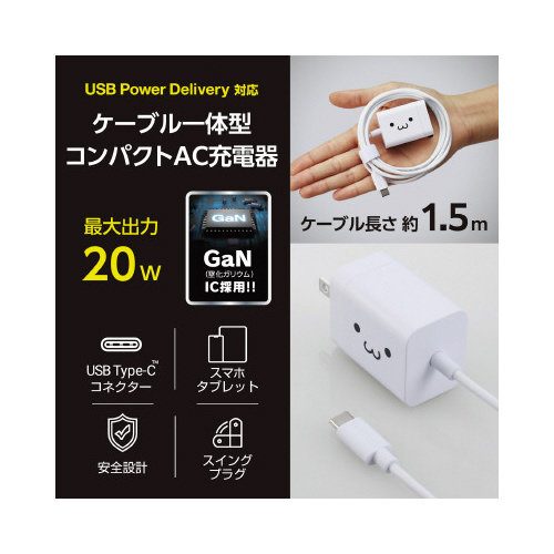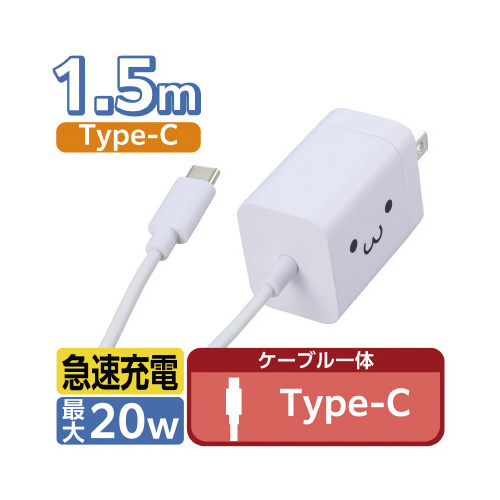 ケーブル一体型で、USBType-C(TM)ポート搭載のスマートフォン、タブレットなどをすぐに充電できるUSBAC充電器です。ケーブルの長さは約1.5mで、取り回しがしやすいです。
