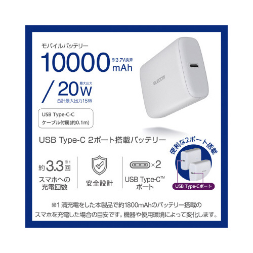 USBPowerDelivery規格に準拠し最大出力20Wの10000mAhモバイルバッテリーです。高出力なのに約190gと軽量でコンパクト、毎日持ち歩けるサイズです。