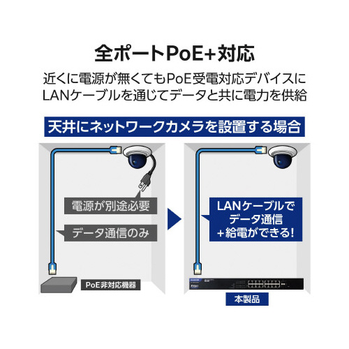 全ポート1Gbpsに対応。Webブラウザー経由でVLAN・QoSなどを設定できる1000BASE-T対応のレイヤー2PoE(210W)Webスマートスイッチ。耐熱50℃、3年保証にも対応。
