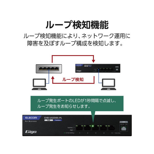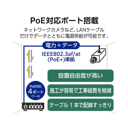 アップリンクポートを除く4ポートがIEEE802.3af/at(PoE+)準拠の給電対応したレイヤー2PoEアンマネージギガスイッチ。合計78W給電可能。ファンレス・静音。耐熱50℃、3年保証。