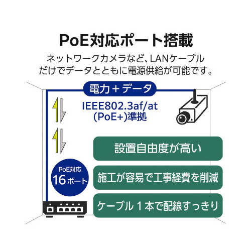 全ポートIEEE802.3af/at(PoE+)準拠の給電に対応したレイヤー2PoEアンマネージギガスイッチ。様々なPoE受電機器に合計210Wまで給電可能。耐熱50℃、3年保証にも対応。