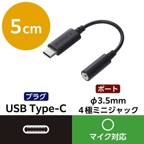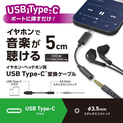 スマートフォン・タブレットのUSB Type-C(TM)ポートをφ3.5mmステレオミニジャックに変換する、音声変換ケーブルです。