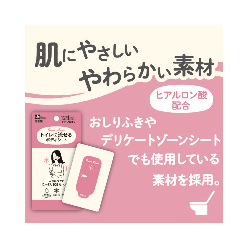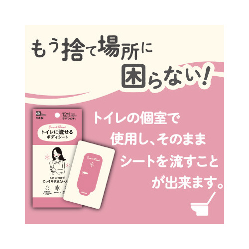 トイレに流せるボディシート!水に流せるシートなのでトイレの個室で使用しそのまま流せます。見えない場所でスマートに汗も気持ちもリセット!ポーチやかばん、ポケットに入るスリムタイプ。サボンの香り。日本製。