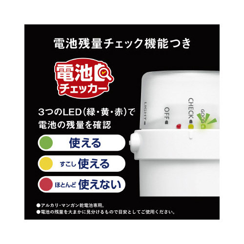 単1形から単4形の電池ならどれでも1本で使用可能なLEDライト。電池残量を3色のLEDで表示する、電池の残量チェック機能付き。明るさ約3.5倍の約50Lm (当社従来品(BFーBM10)比較)。