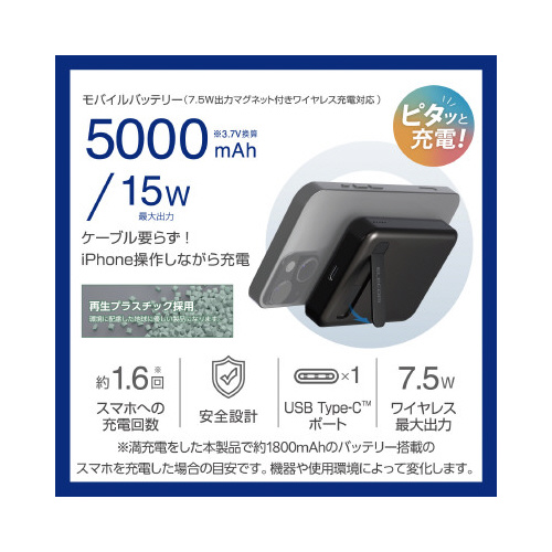 ワイヤレスでどこでも簡単充電!MagSafe対応iPhoneにマグネットで取り付け、7.5Wのワイヤレス充電ができるモバイルバッテリーです。