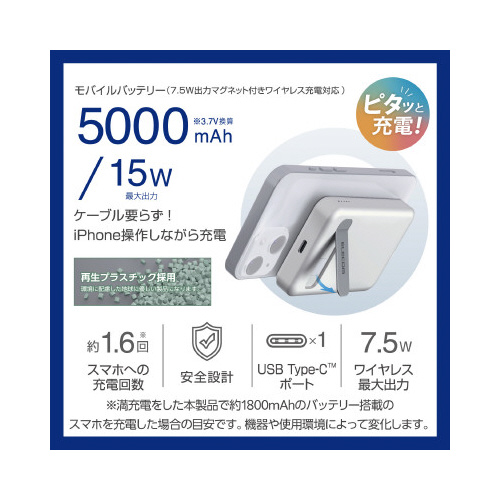 ワイヤレスでどこでも簡単充電!MagSafe対応iPhoneにマグネットで取り付け、7.5Wのワイヤレス充電ができるモバイルバッテリーです。