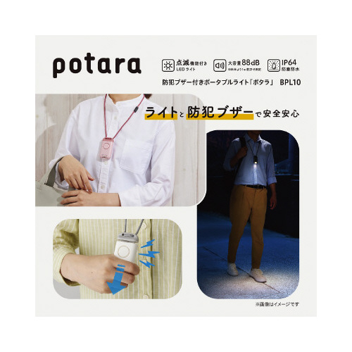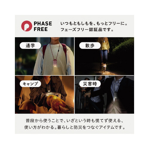 「ポタラ」は足元までしっかり照らすLEDライトと大音量の防犯ブザー、二つの機能を搭載!夜間の帰宅やアウトドアでお使いいただけます。フェーズフリー認証品で、普段使いはもちろん、災害時にも活躍します。