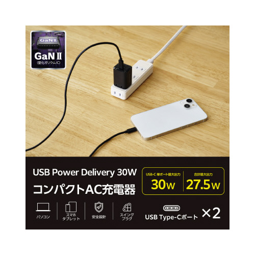 ●対応機種/各USBType-C(TM)ポートからUSBPowerDelivery30WおよびPPS(ProgrammablePowerSupply)30Wの規格内で充電が可能なノートパソコン、スマートフォンなどの機器。2ポート同時接続時、合計最大27.5Wまでの出力で充電・給電可能な機器とその組み合わせ。