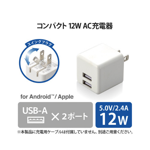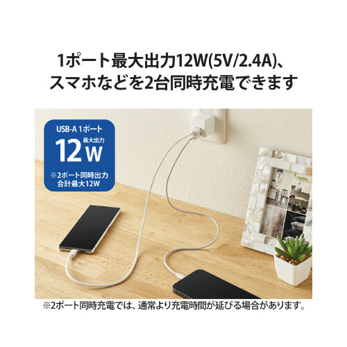 家庭用コンセントからスマートフォンやタブレット等を充電、給電できるAC充電器です。USBAポートを2つ搭載し、接続された機器を自動的に見分けて適した出力で充電できる“おまかせ充電”に対応しています。