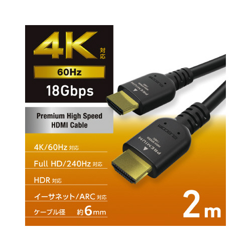 最大4K/60Hzの解像度に対応した、イーサネット対応プレミアムハイスピードHDMI(R)ケーブルです。安定した映像信号と音声信号の伝送を実現し、100Mbpsのイーサネット通信にも対応しています。