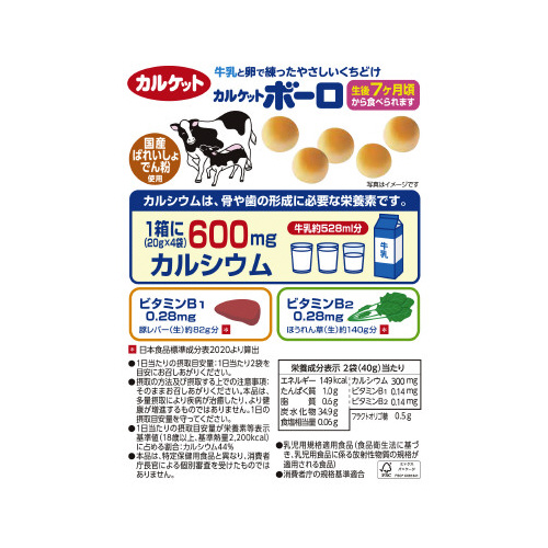 牛乳と卵で練ったやさしいくちどけが特長のひと箱にカルシウム600mgが入ったボーロです。