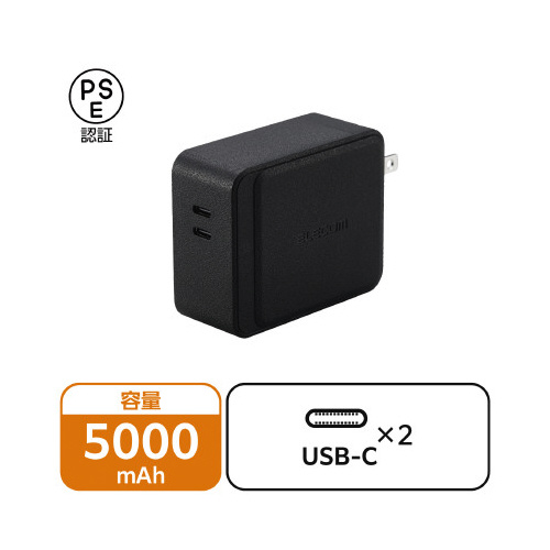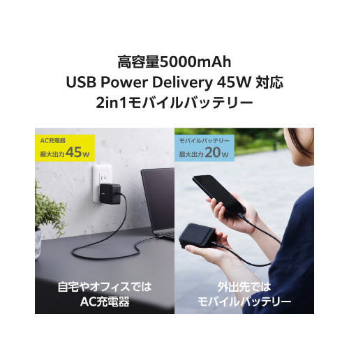 モバイルバッテリーとAC充電器の1台2役。コンパクトで高速充電可能な5000mAhのAC充電器一体型モバイルバッテリー。Type-Cポート2つ搭載、USBPowerDelivery45W対応。
