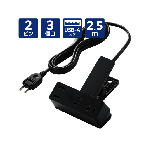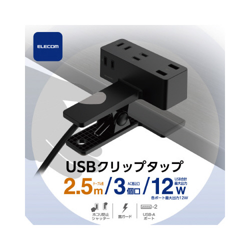 クリップ機構付きUSB-A電源タップ。常設できない場所に一時的に電源を設置可能。調理機器やテレワークに便利。コード約2.5m。