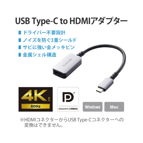 USBType-C(TM)コネクターを搭載した機器の映像信号を変換し、HDMI入力コネクターを搭載したディスプレイ・テレビ・プロジェクターなどに出力することができるHDMI映像変換アダプターです。