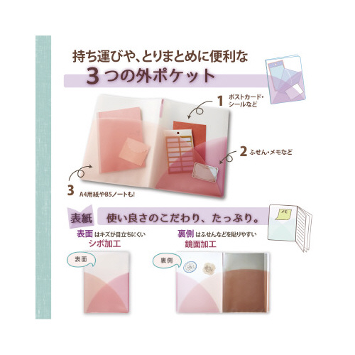 好きな色で毎日を楽しい気分に、パステルカラーのファイル!持ち運びや、とりまとめに便利な3つの外ポケット付き。外側は傷が目立ちにくいシボ加工。内側はふせんなどを貼りやすい鏡面加工。