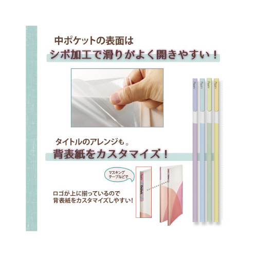 好きな色で毎日を楽しい気分に、パステルカラーのファイル!持ち運びや、とりまとめに便利な3つの外ポケット付き。外側は傷が目立ちにくいシボ加工。内側はふせんなどを貼りやすい鏡面加工。