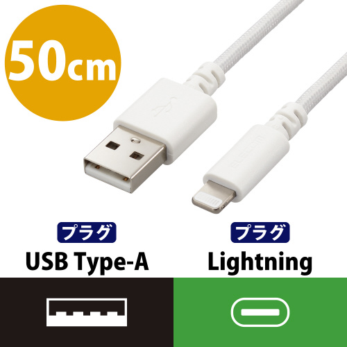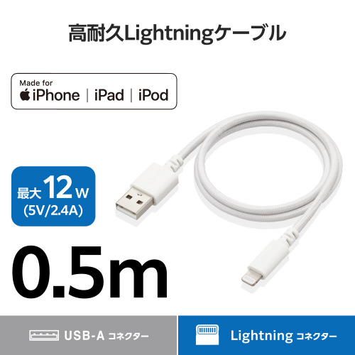 Lightningポート搭載のiPhone/iPod/iPadとUSB-Aポート搭載のパソコンおよびAC充電器を接続して充電・データ通信ができる高耐久ケーブル。コネクター付け根部分の耐久力を高めてます