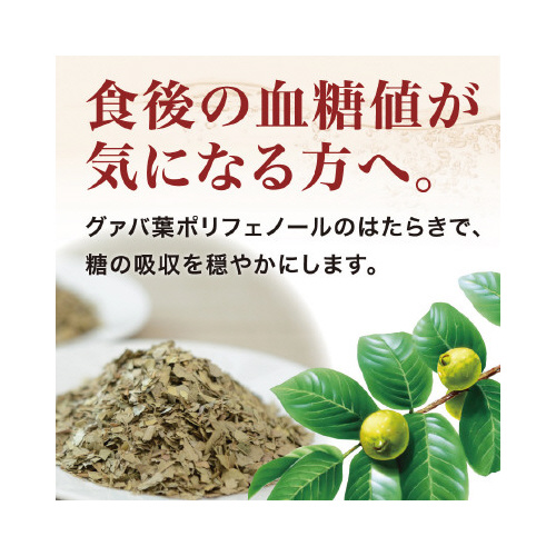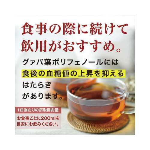 【特定保健用食品】グァバ葉ポリフェノールの働きで、糖の吸収をおだやかにするので、食後の血糖値が気になる方に適した飲料です。